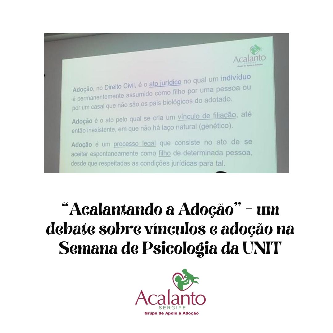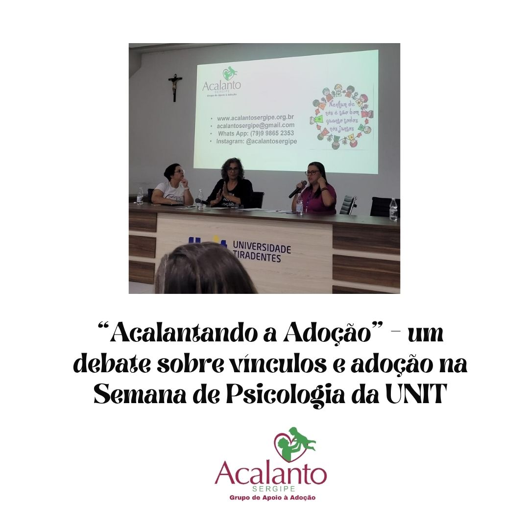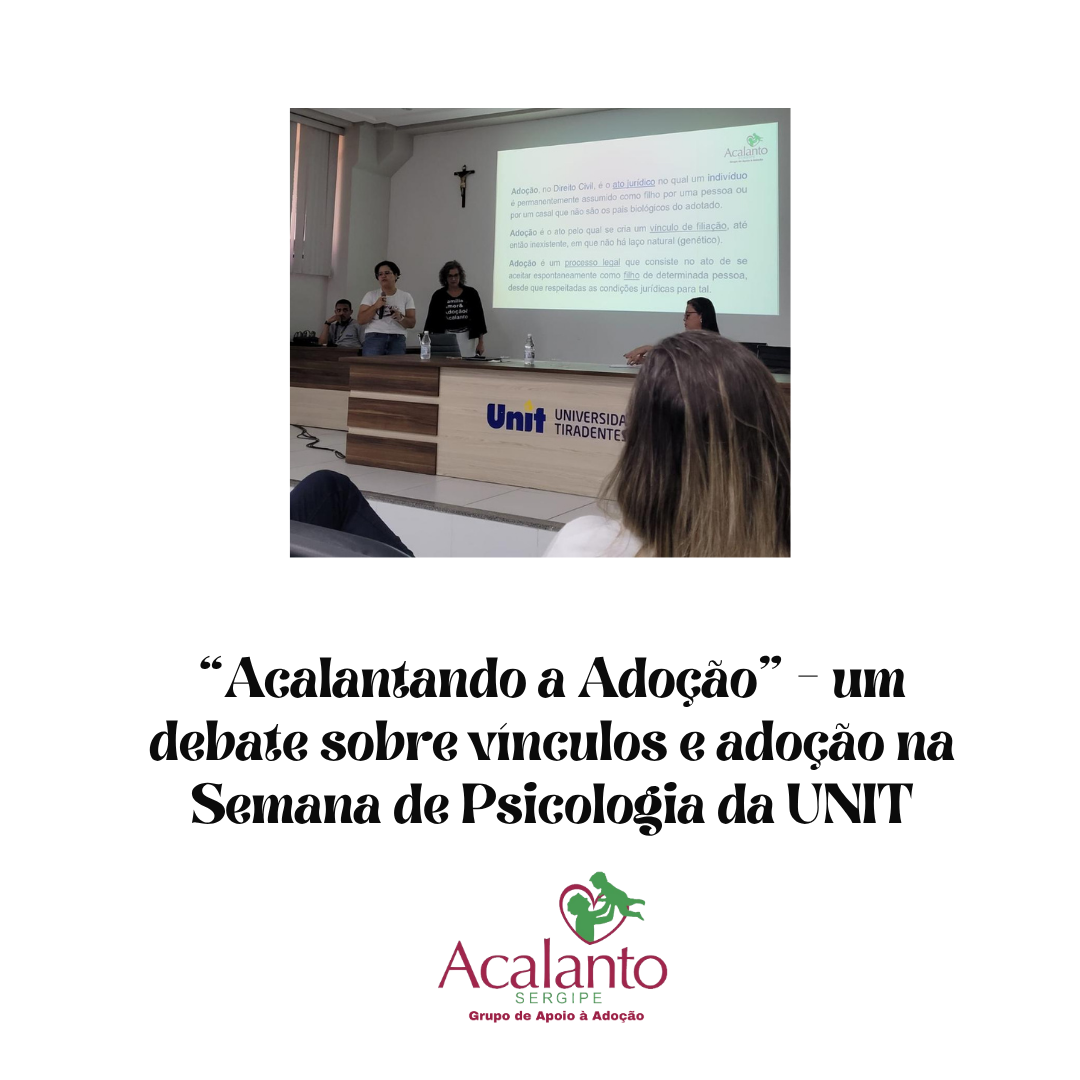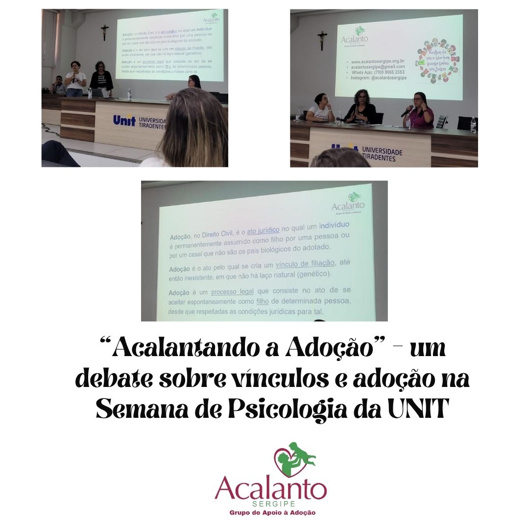 O Grupo de Apoio à Adoção Acalanto Sergipe marcou presença na Semana de Psicologia da Universidade Tiradentes (UNIT), cujo tema foi “Psicologia Jurídica: Conexões entre Subjetividade, Direito e Interdisciplinaridade”. O grupo participou de uma mesa-redonda na manhã de 08/10/2025, intitulada “Acalantando a Adoção: a importância do trabalho de prevenção para a formação de vínculos saudáveis”, com o objetivo de levar o tema da adoção segura, legal e respeitosa para o debate acadêmico.